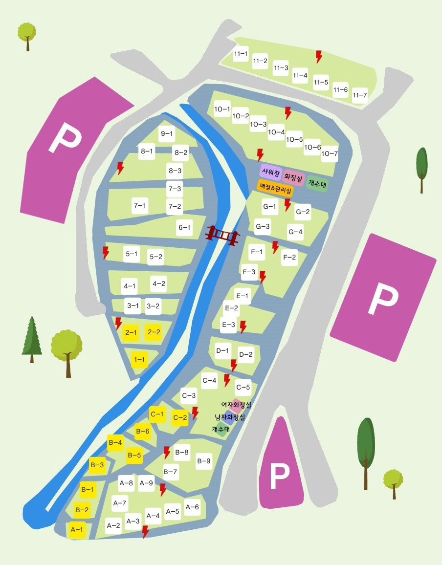 A사이트 쪽이 하류이며 관리동과의 거리가 상당하기 때문에 C사이트 쪽에 별도로 화장실 및 개수대가 위치하고 있습니다.