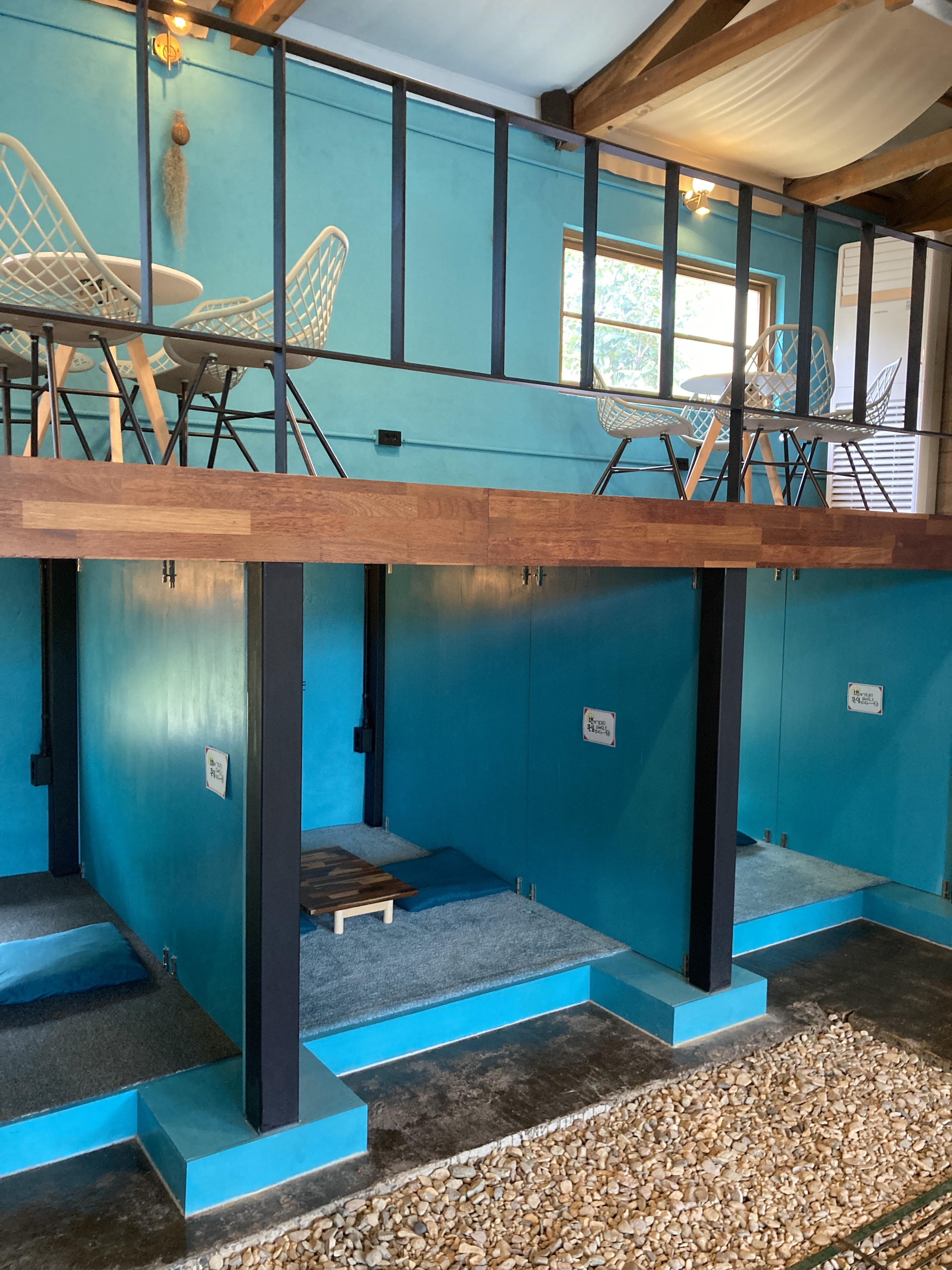 좌식 자리에 벽이 부서진 모양으로 창이 나있는데