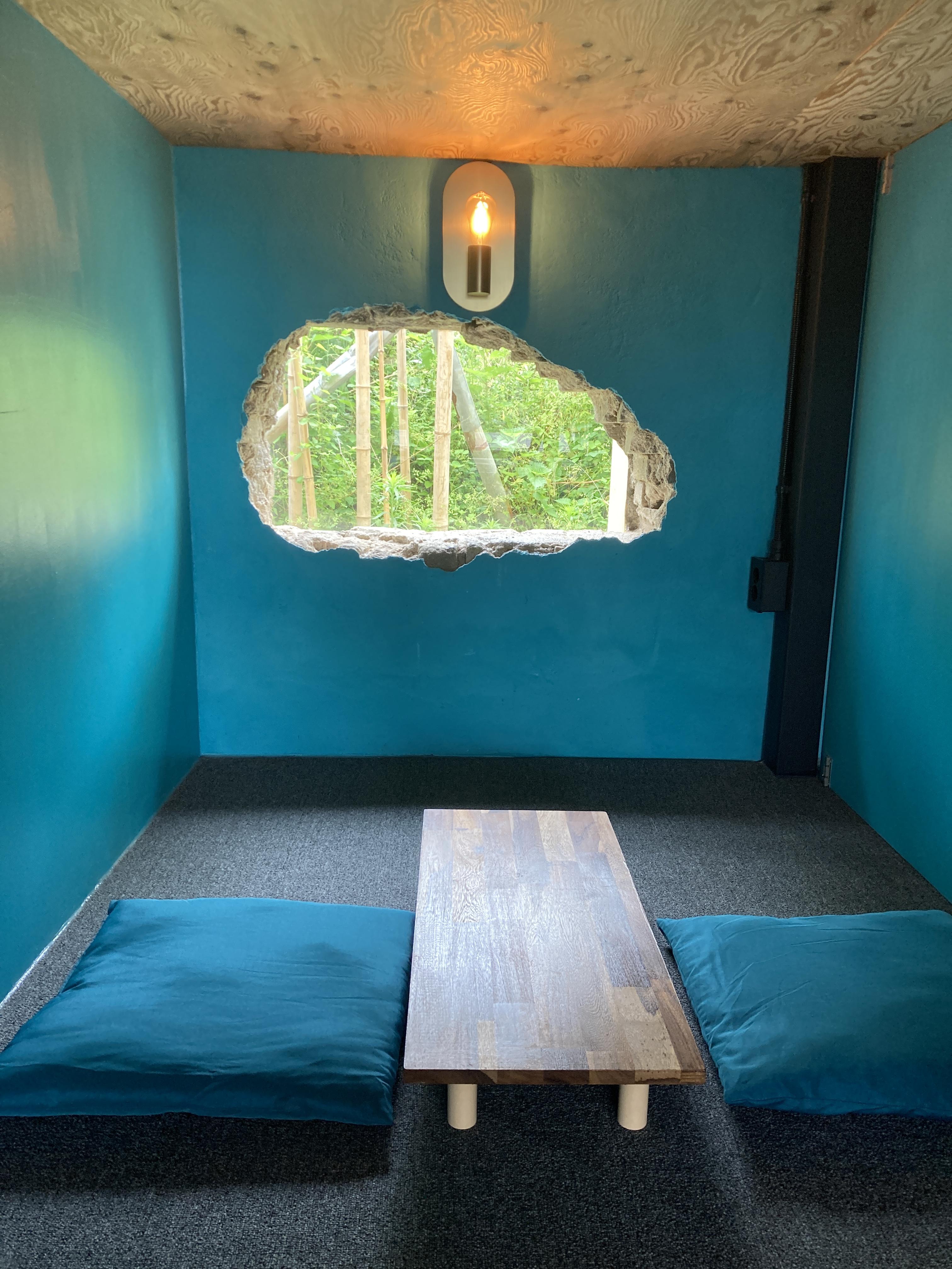 좌식 자리에 벽이 부서진 모양으로 창이 나있는데