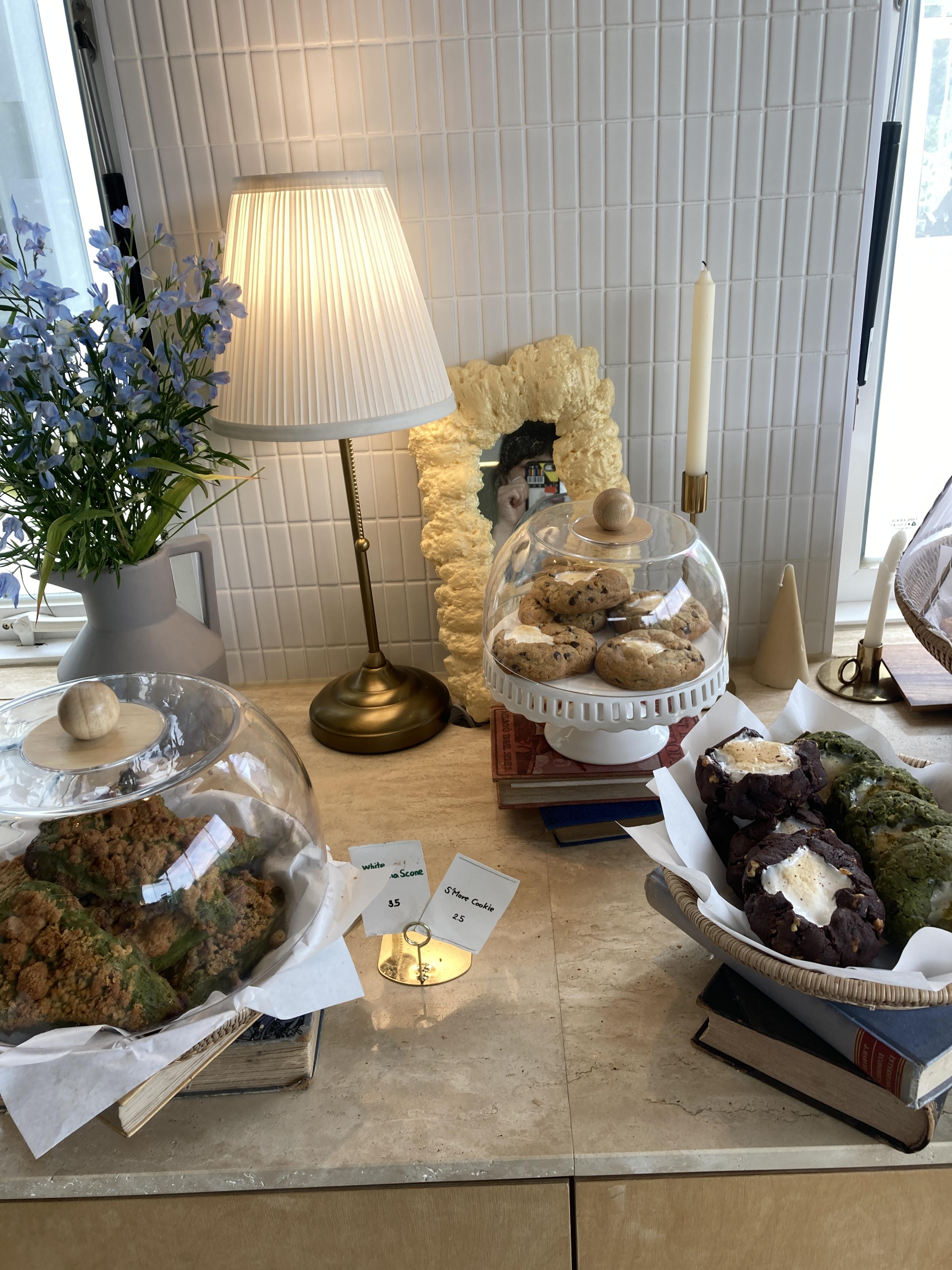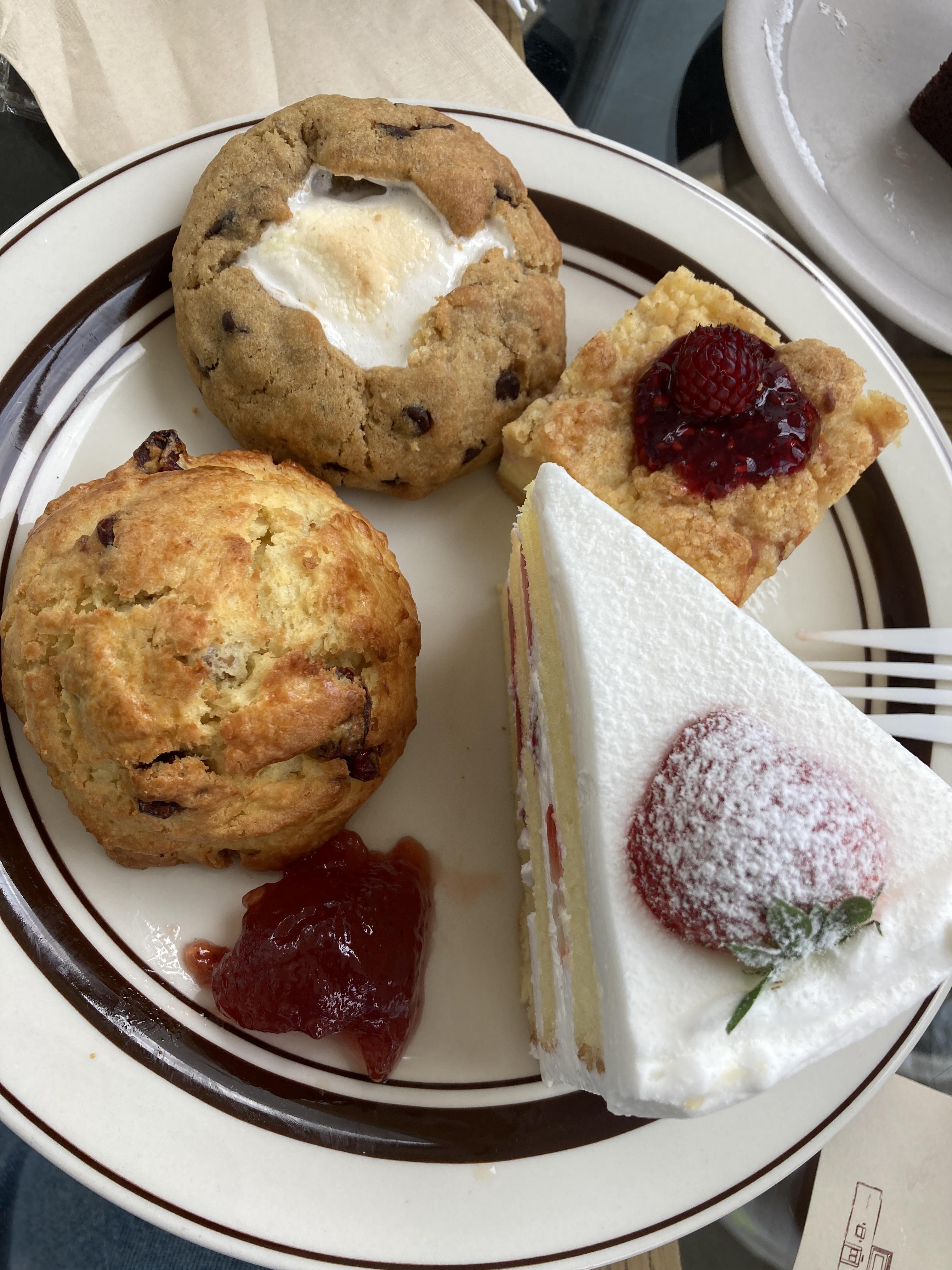 디저트는 크랜베리 스콘, 초코칩 스모어 쿠키, 치즈 케이크, 딸기 생크림 케이크, 초코 파운드케이크 이렇게 시켰어요.