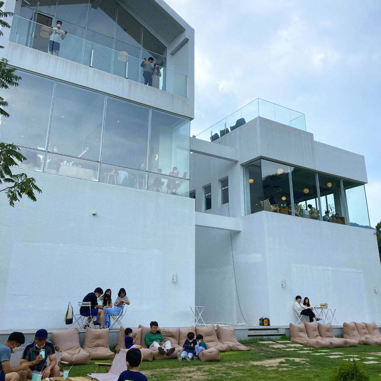 어른들은 앉아서 커피 마시고 아이들은 잔디밭에서 놀고...