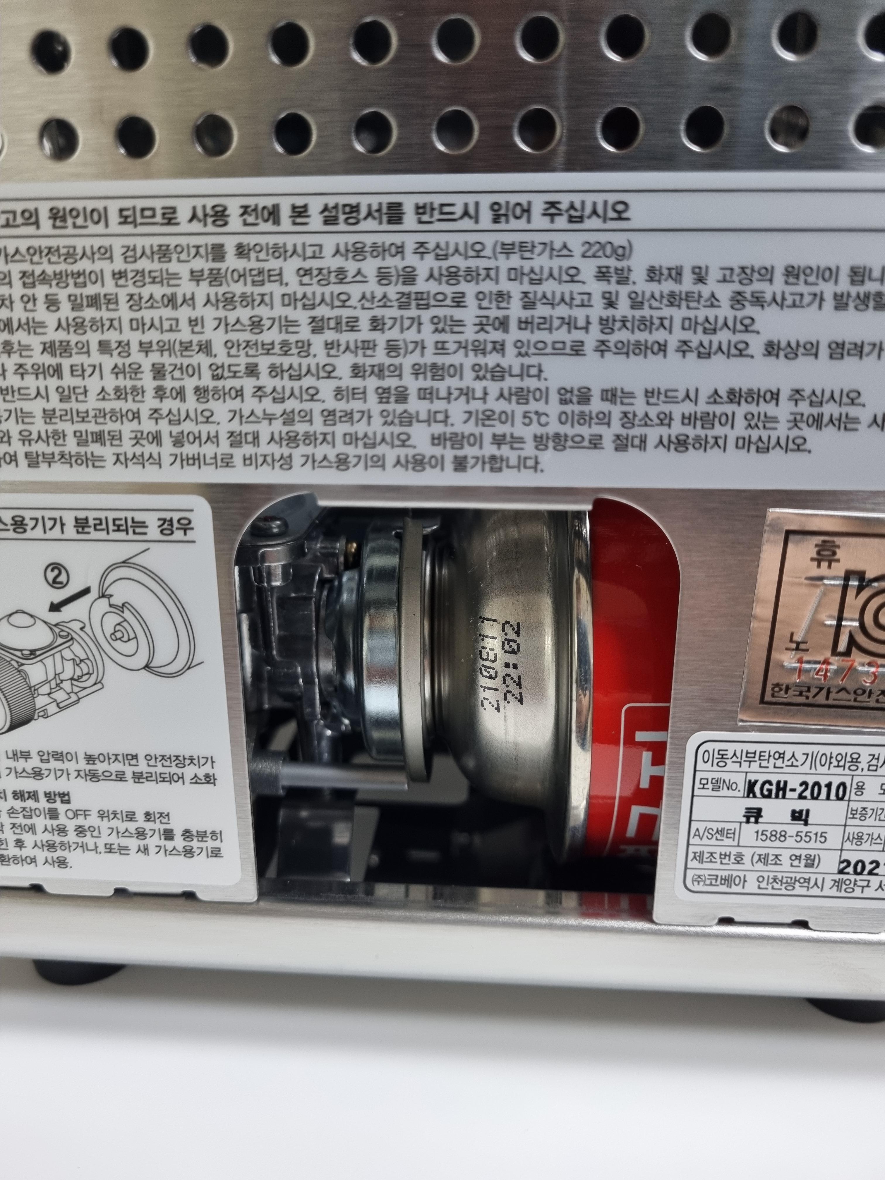 사진에서 보시듯이 자석식으로 가스를 체결하게 되어 있어 홈에 맞춰서 밀어 넣으면 가스통이 달라붙는 방식입니다.