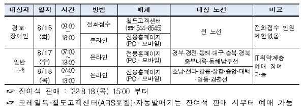 - 예매 홈페이지(www.letskorail.com)는 2022. 8. 12(금) 14시부터 운영합니다.