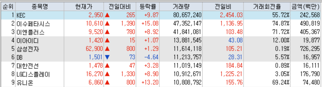 - 우리이앤엘 : LED 패키지 사업을 영위하는 업체. 특별한 호재나 공시 없이 과대낙폭 저가매수세 유입으로 보임.