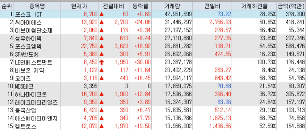 오늘은 반도체주와 2차전지주가 주로 상승했고, 그중에서도 개별 호재가 있는 것들이 상한가를 가는 모습이었네요.