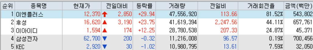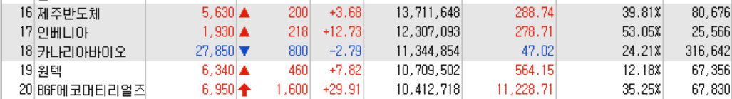 - 인베니아 : 삼성디스플레이, 4~5조원 규모 디스플레이 단지 투자 소식 등에 OLED 테마 상승 속 급등. 어제에 이은 OLED 관련주 강세.