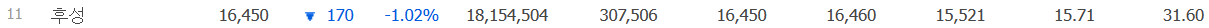 - 후성 : 후성은 불소를 기반으로 한 냉매가스와 반도체용 특수가스, 2차전지 재료(전해질 소재인 LiPF6) 및 자동차용 냉매가스를 생산하는 업체이다. 어제 조달청장 방문으로 급등 후 약 하락.