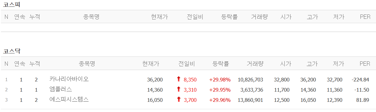 - 카나리아바이오 : 어제 적정의견 감사 보고서 제출로 시간외 상한가 갔다가 오늘 상한가.