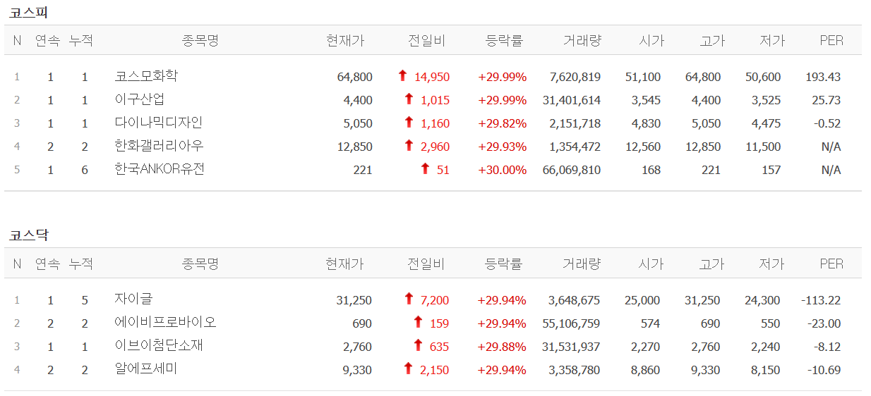 ● 코스피 상한가 : 4종목