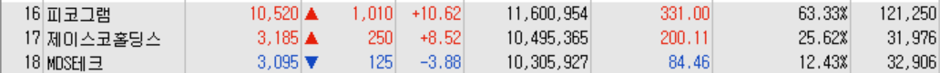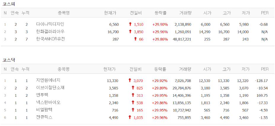 - 한화갤러리아우 : 신규상장 3일째로 계속 상한가. 별다른 호재 없음.