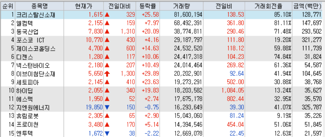 - 케일럼 : 시총 688억으로 특별한 호재나 공시 없음. 계속되는 장기 하락에 대한 반발 매수세 정도로 보고 있음.
