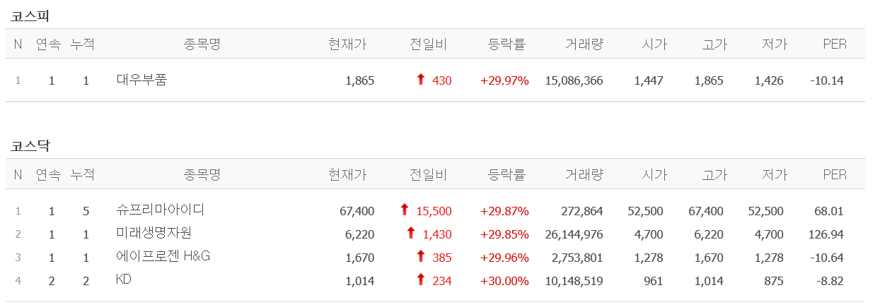 - 대우부품 : 523억원 규모의 북미향 현대, 기아차 전기차용 배터리 히터 공급 소식에 상한가.