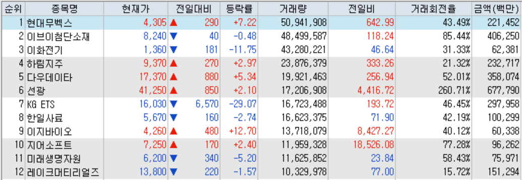 천만주 중에도 하락한 종목이 반이나 됩니다.