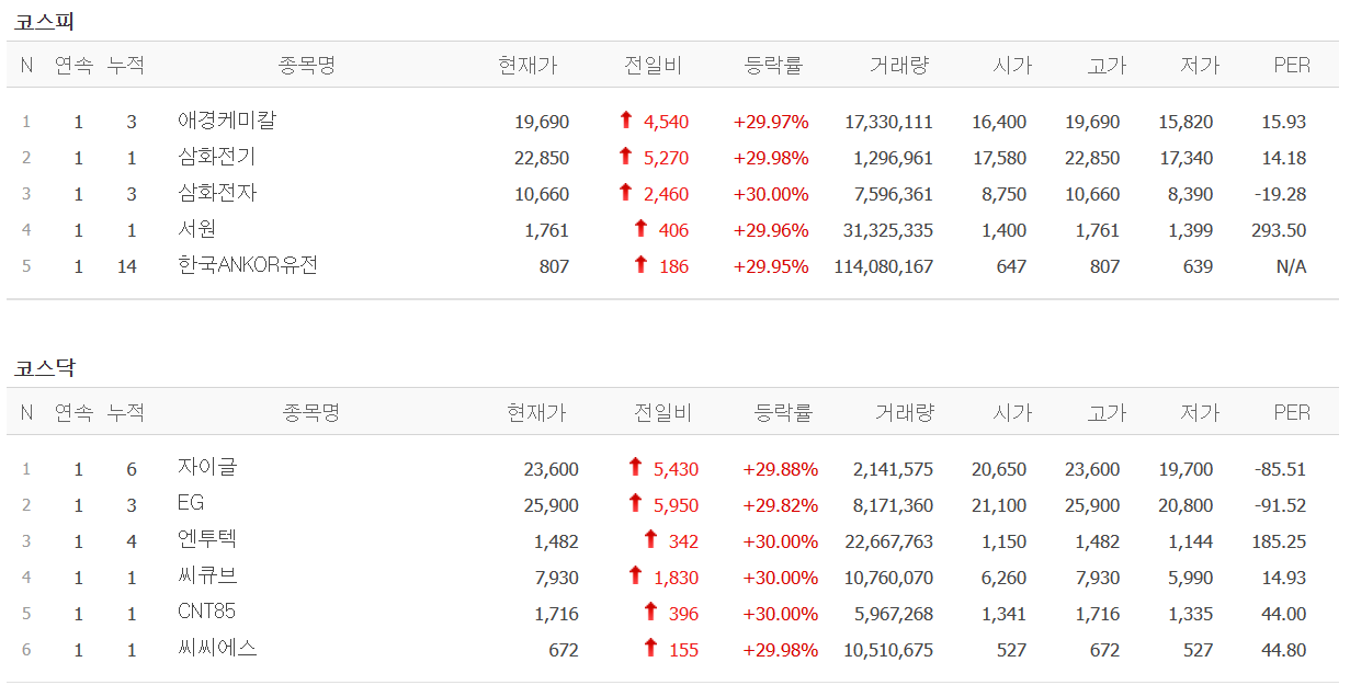 - 애경케미칼 : #음극재관련주 별다른 호재나 공시 없음 2차전지 테마주 상승 속 상한가.
