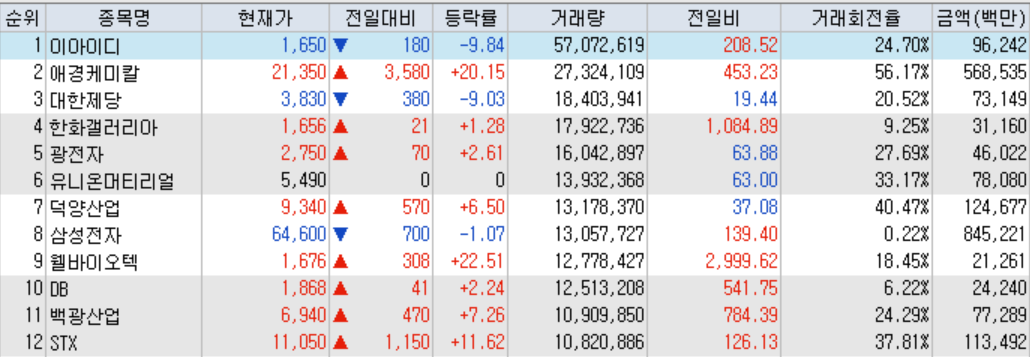 지수는 하락했지만 어째 상한가 천만주 종목은 많은것 같네요.