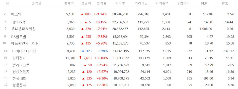 - 에스엔유 : 에스엔유가 장비를 납품하던 미국 업체 이매진(마이크로 OLED기술 보유)이 삼성디스플레이에 넘어갔다는 소식에 상한가.