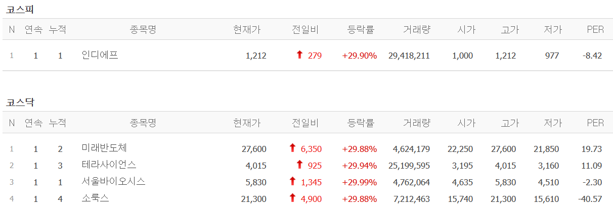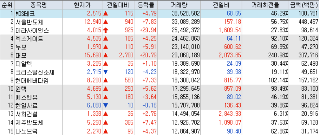 - 미래반도체 : 지난밤 미장 필라델피아 반도체지수가 3.16% 상승하면서 이름에 ‘반도체’가 들어간 종목들이 상승했음.