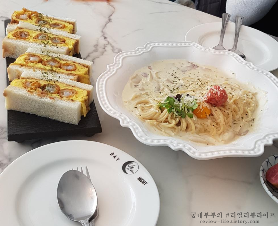 브런치 겸 먹으러 갔기 때문에 명란 크림 파스타랑 에그 쉬림프 샌드위치를 시켰다.