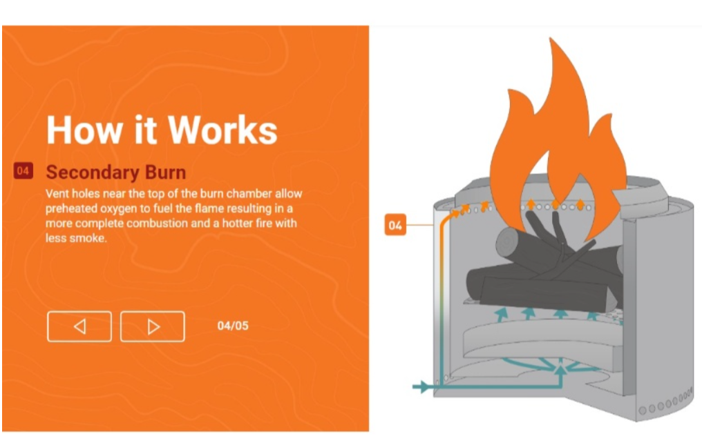 장작이 바로 연소되는 것이 아닌 연소 가스가 2차로 나뉘어서 연소된다고 제조사는 설명하고 있습니다.