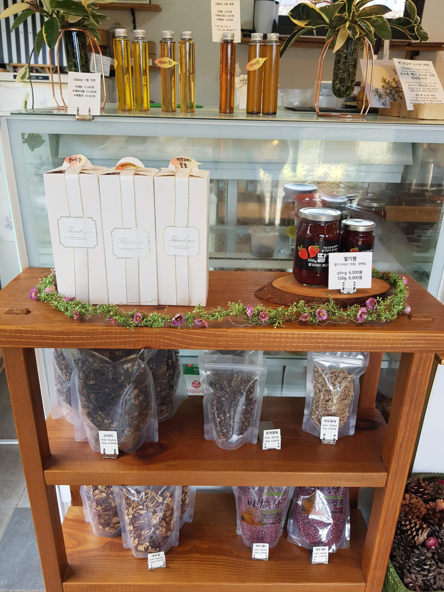 카페 한편에 맨드라미 꽃초, 치커리청, 딸기잼, 고사리, 대추칩 등 시골에서 팔법 한 것들을 진열해 둠