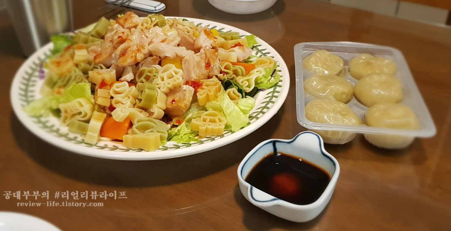 더 부드러운 닭가슴살로 만든 샐러드 파스타(2인분이에요;;) 사이드로 곁들인 놀랄만두해