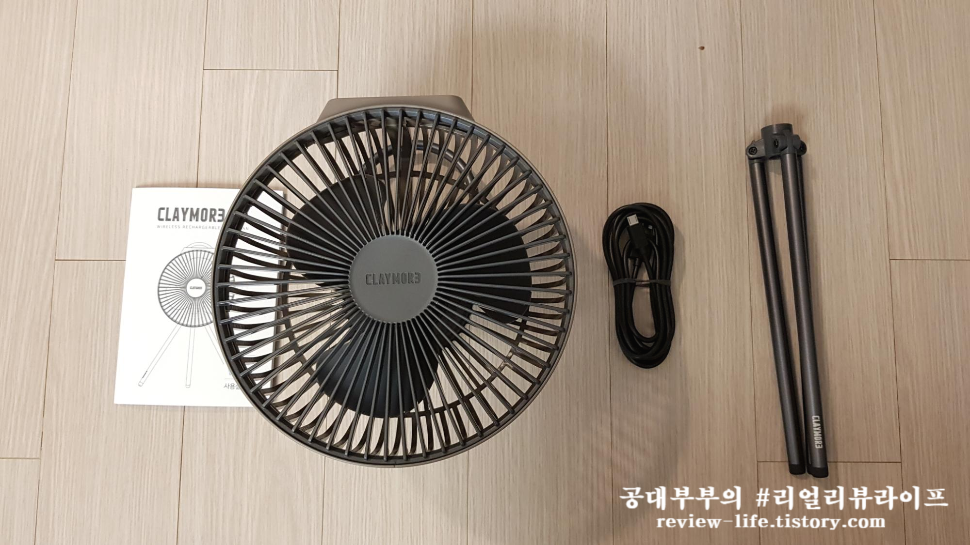 구성품은 설명서, 선풍기 본체, 충전케이블, 다리로 구성되어 있습니다.