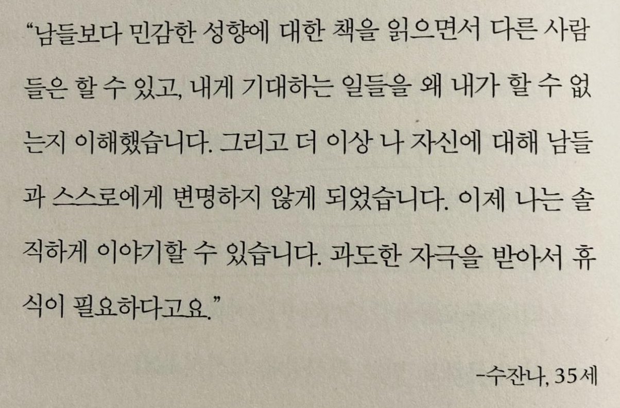남편한테 내가 왜 예민한지 내 기질이 어떤지 궁금하면 책을 한 번 보라고 말해주고 싶어요.