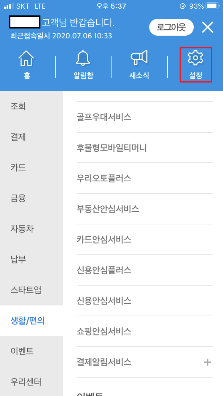 [생활/편의] - [결제알림서비스]를 누르고