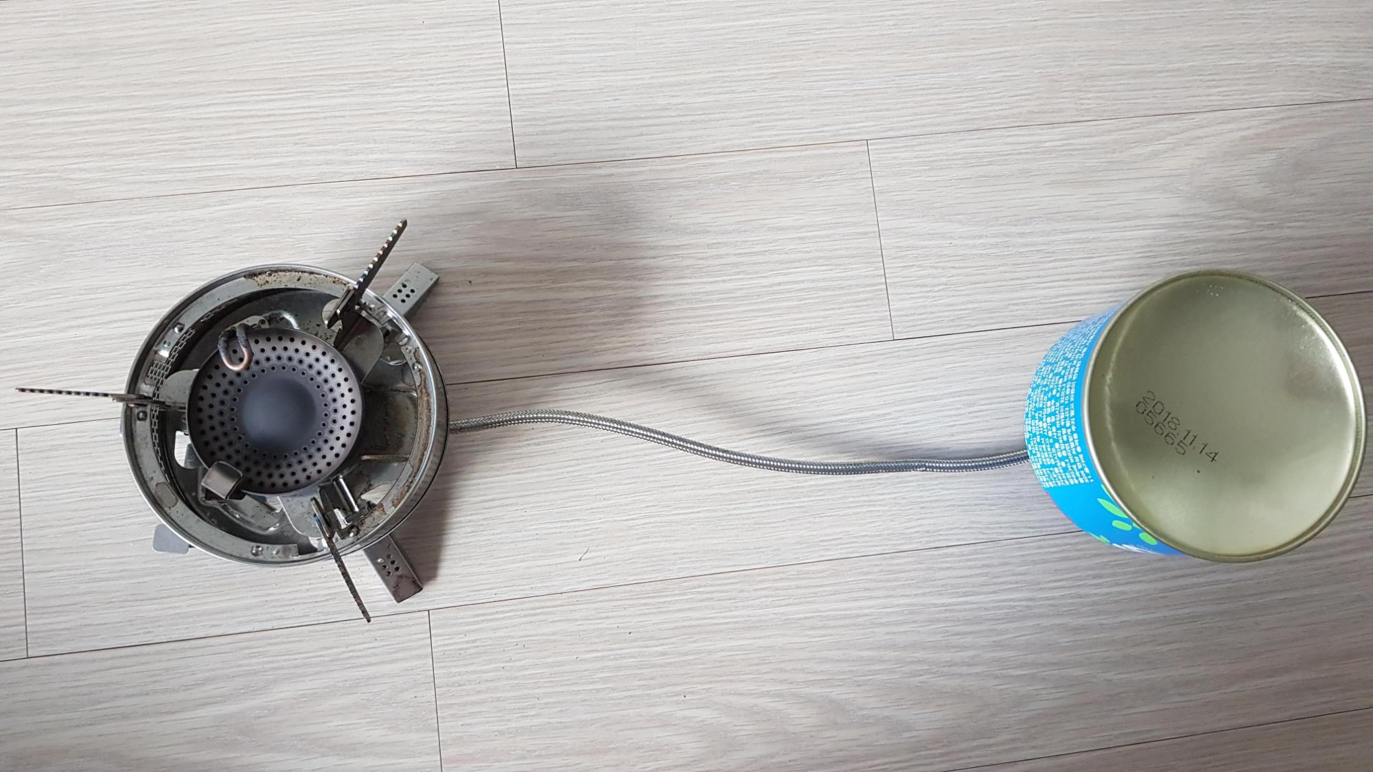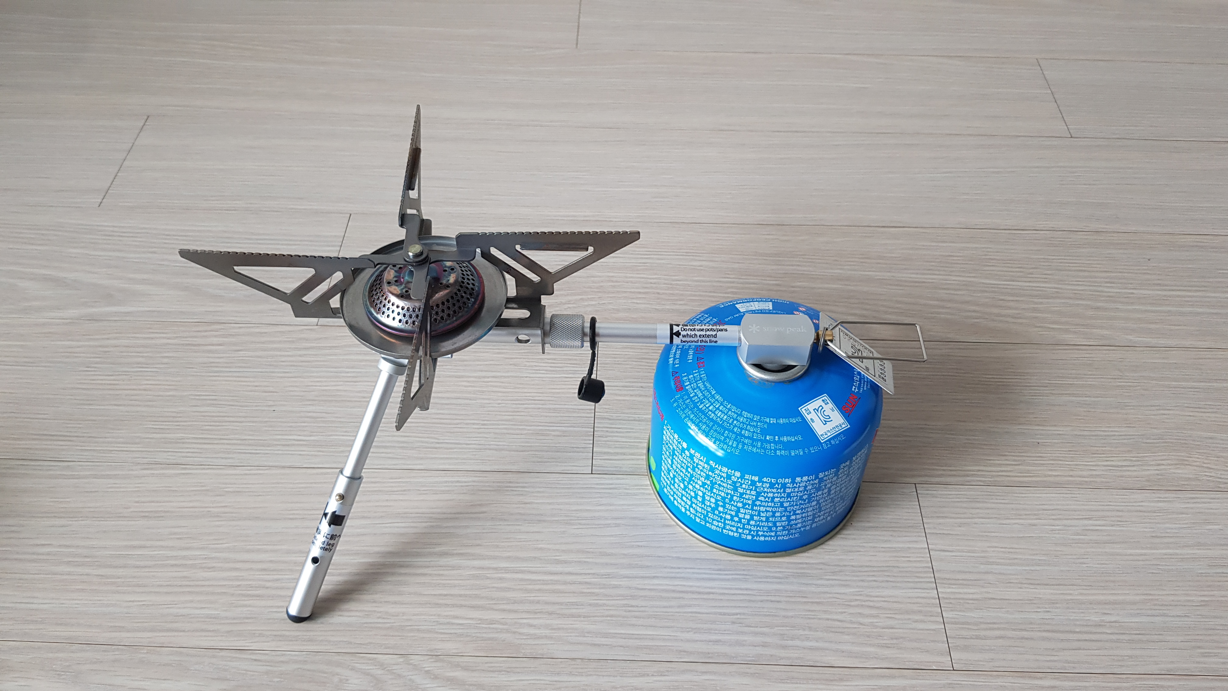 이 제품은 호스식과 직결식의 중간 형태라고 할 수 있는데요. 버너 본체의 다리 두개와 가스통의 지지력이 조합되어