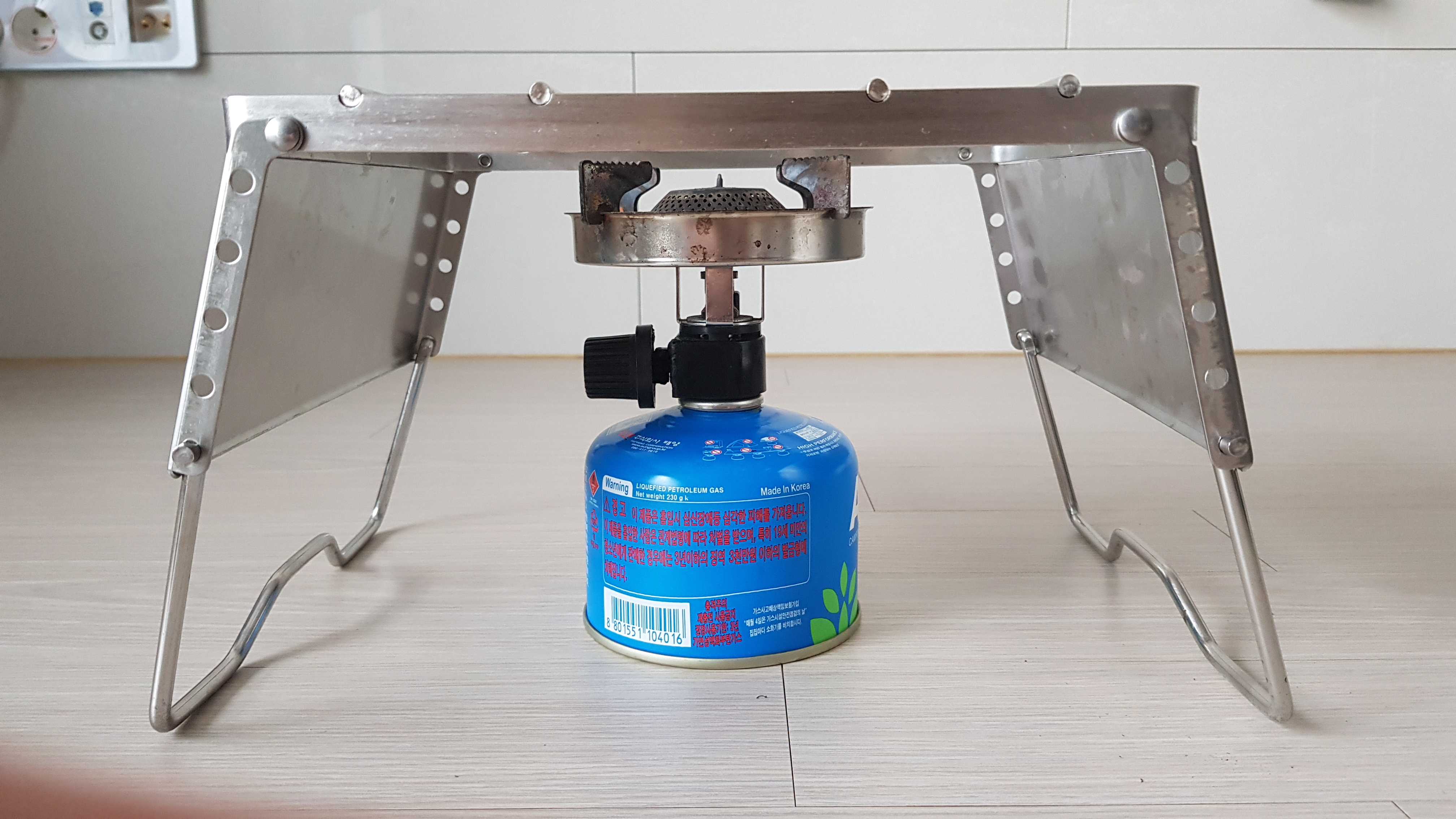 무겁기도 하고 들고다니기 귀찮긴 하지만 나름 바람막이도 되고 안정성은 버너 단독으로 사용하는것과는