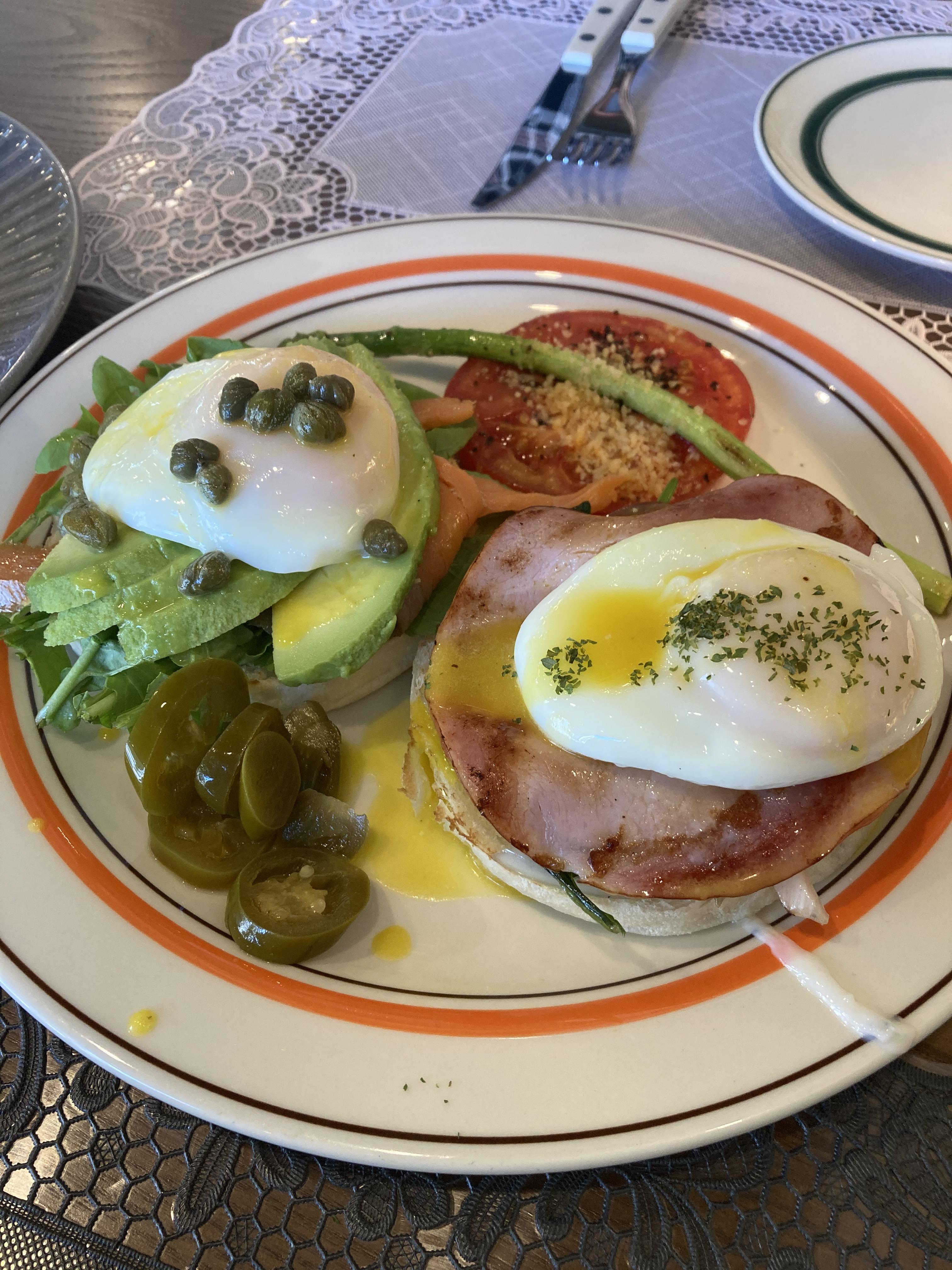에그베네딕트는 두개로 나오는데 하나는 햄이 올라갔고 하나는 연어랑 아보카도 조합으로 되어있음